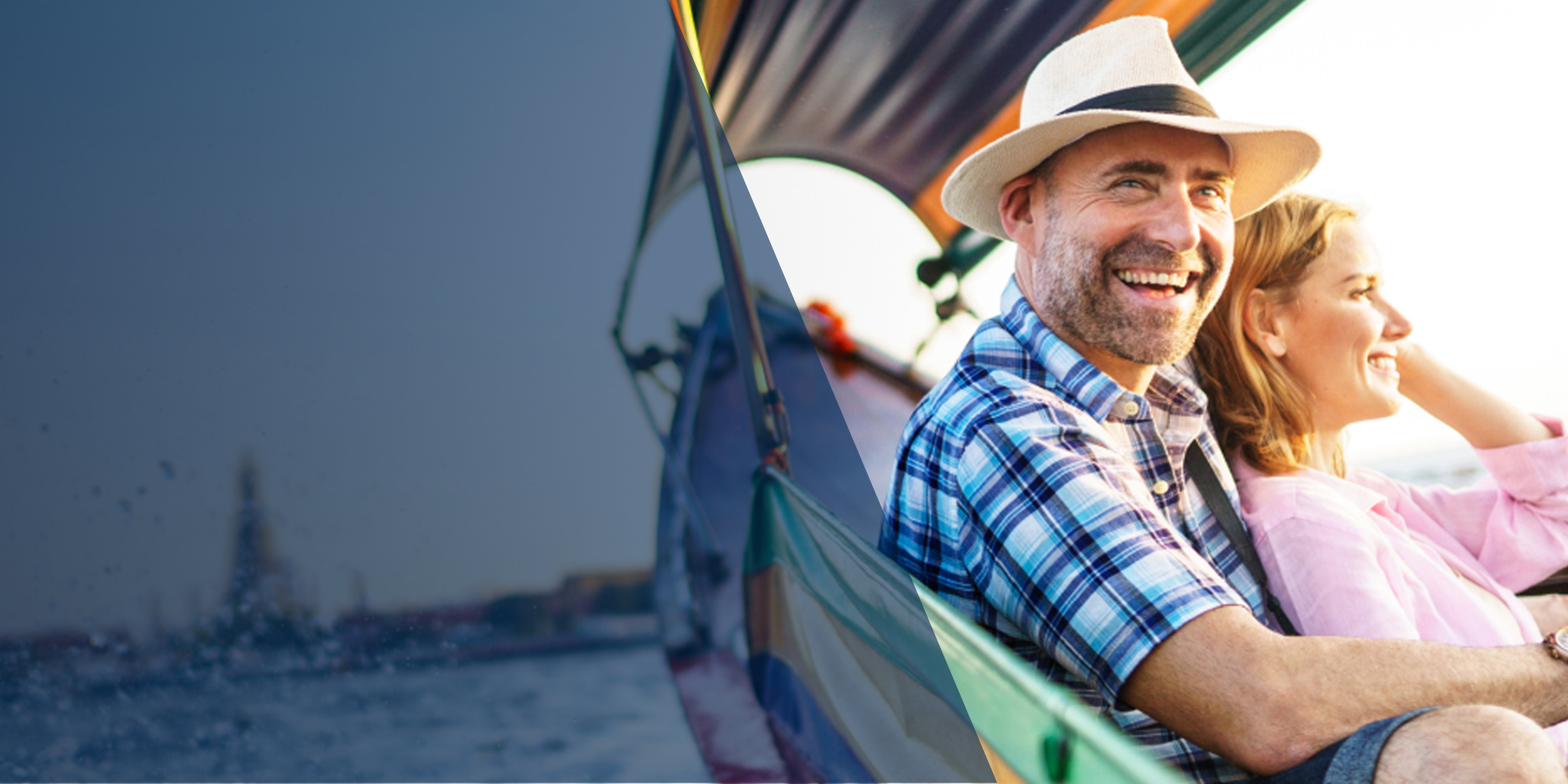 A couple sit together at sunset and smile.